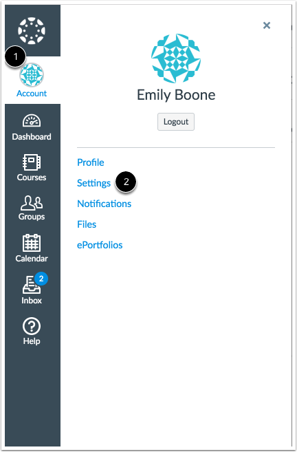 In Global Navigation, click the Account link [1], then click the Settings link [2].