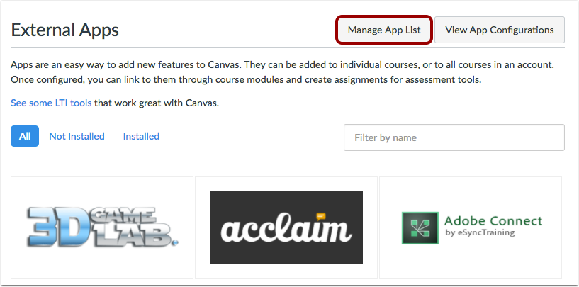 Note: To access the Manage App List button in the Apps tab in Account Settings, you must have the Manage LTI permission enabled.