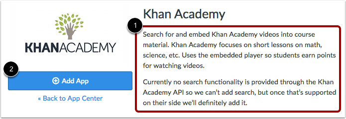 On the details page, you can view a description of the app [1]. When you are ready to install the app with the proper credentials, you can add the app as a tool for your course [2].