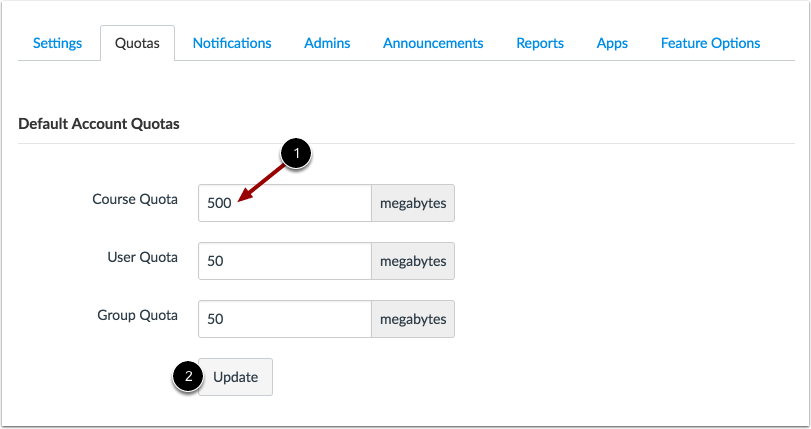 To change quotas, type a new number in the quota fields. Changing the quota will change the quotas for courses, users, and/or groups for the entire account.