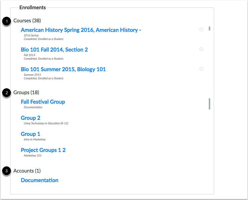 As an admin, you can view all course, group, and account enrollments for a user in your account.