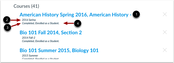 Each course includes the course name [1], the term where the course resides [2], the user's enrollment status [3], and the user's role [4].