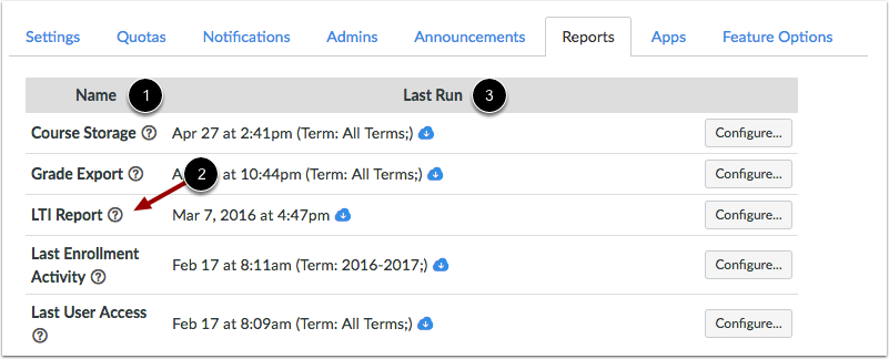 Account-level admins have access to Canvas reports that can be used to review account data. Canvas includes a set of default reports, though other customized reports may be included for your institution. Learn about report configurations in the Canvas Default Account Reports resource document.