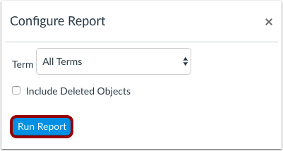 All reports except the LTI Report, Outcome Export, and User Access Tokens reports require you to select a term. In the Term drop-down menu, you can choose from the Default Term [1], or any active, future, or past terms. Courses with hidden assignments may not accurately reflect scores in this report.