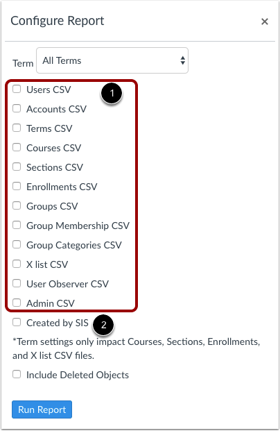 If you want to only view data created by your SIS, select the Created by SIS checkbox [2]. Otherwise, the CSV files display all data created in your Canvas account, including information created by SIS and through the interface.