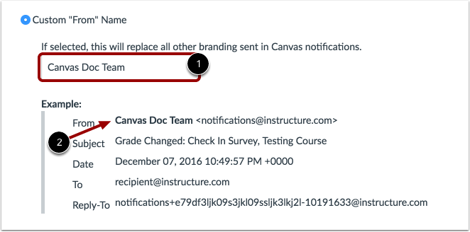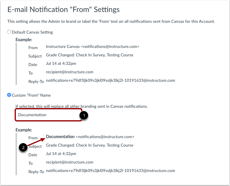 If you do not want to have a Custom "From" Name, select the Default Canvas Setting option [1]. The "From" name will display as Instructure Canvas [2].