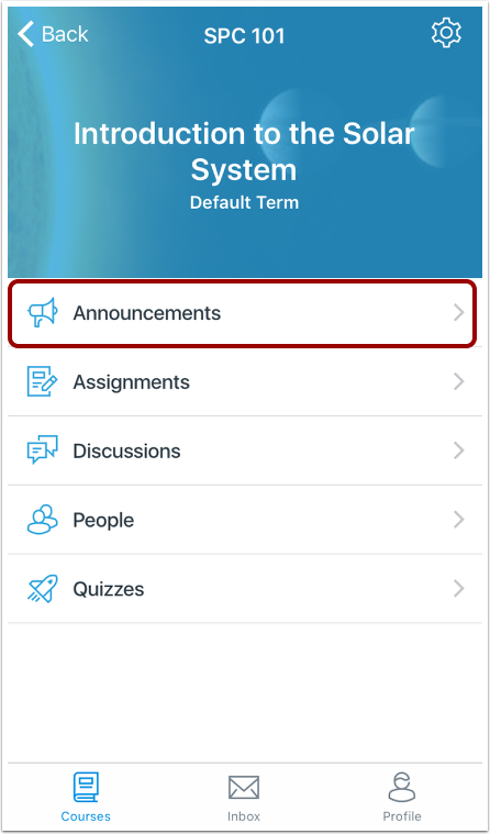 Announcements displays all the announcements in your course. Announcements are ordered by creation date with the most recent at the top.